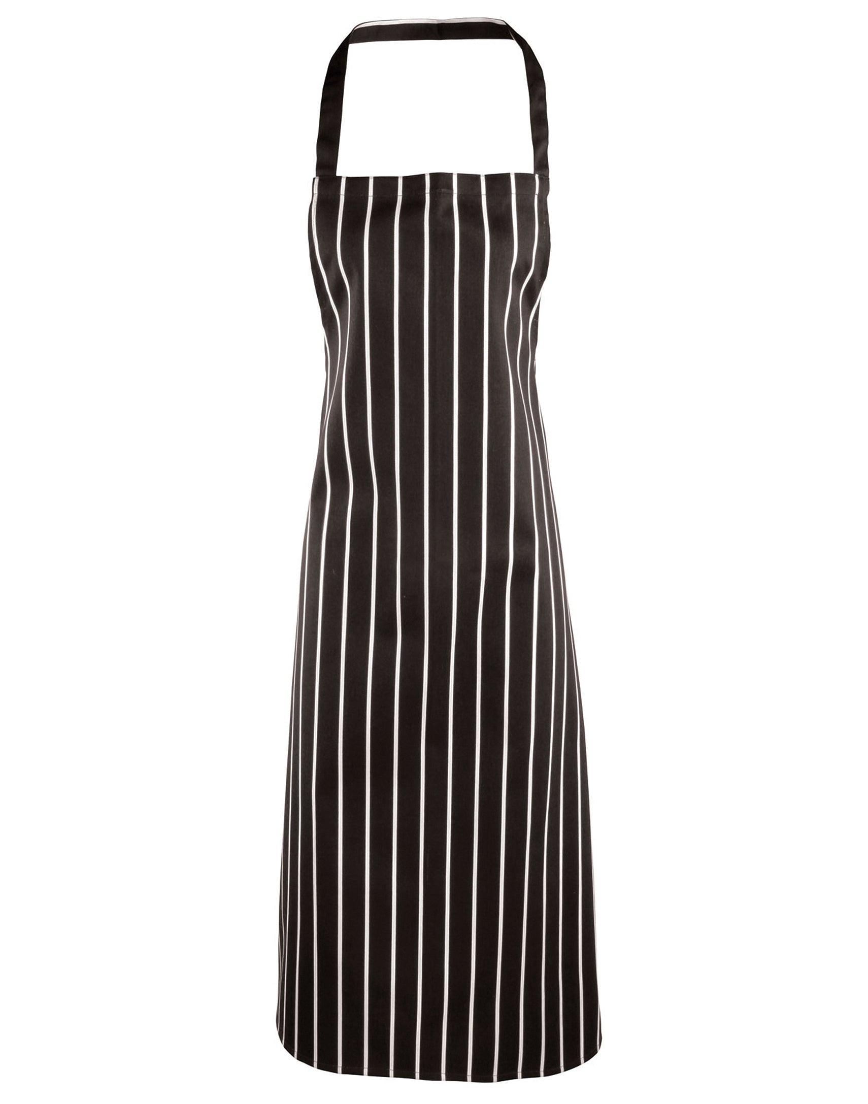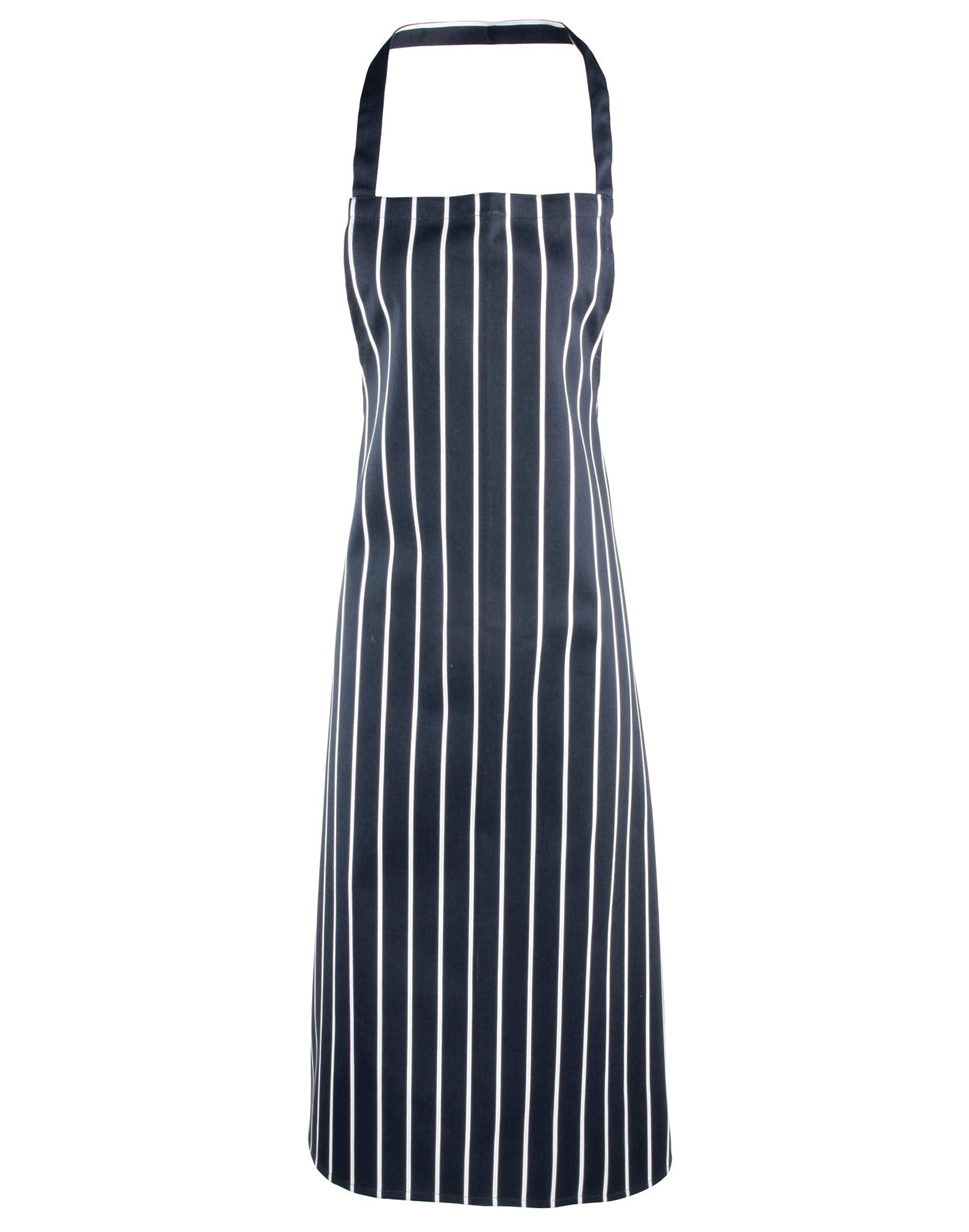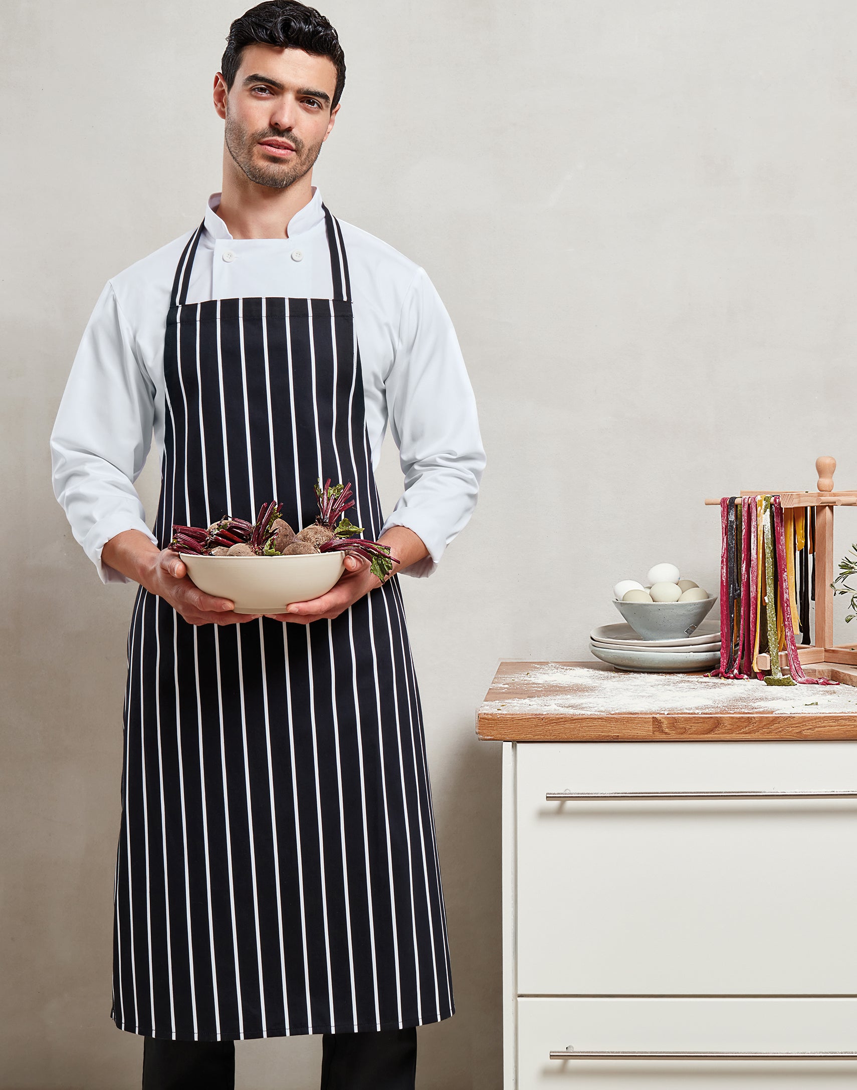The apron is available in Black and Navy with white stripes, providing versatile options to suit your style. It is designed for easy maintenance, being machine washable at high temperatures, making it suitable for heavy-duty kitchen environments.